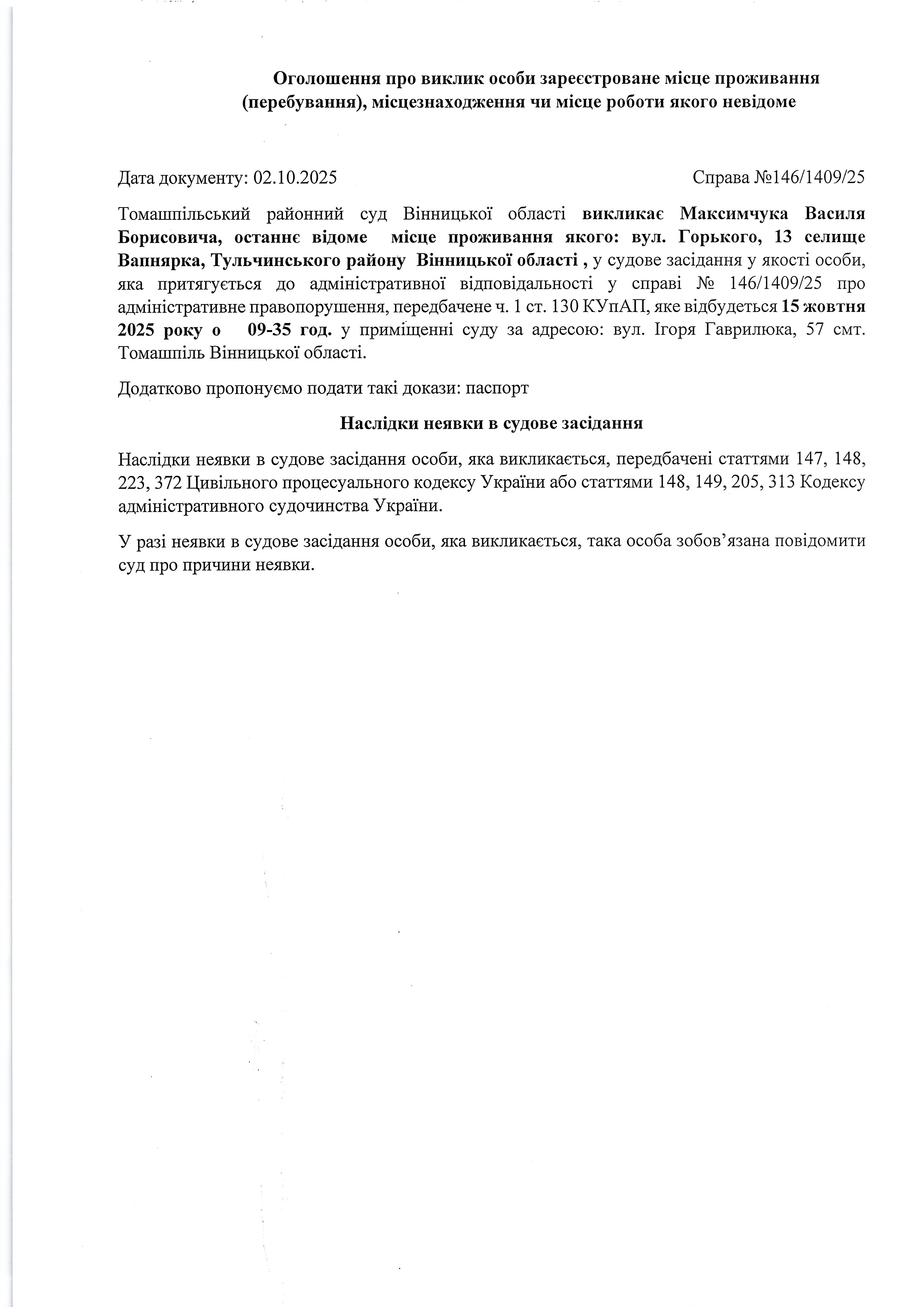 Оголошення про виклик до суду Максимчука В.Б.. на 09:35 год. 15.10.2025