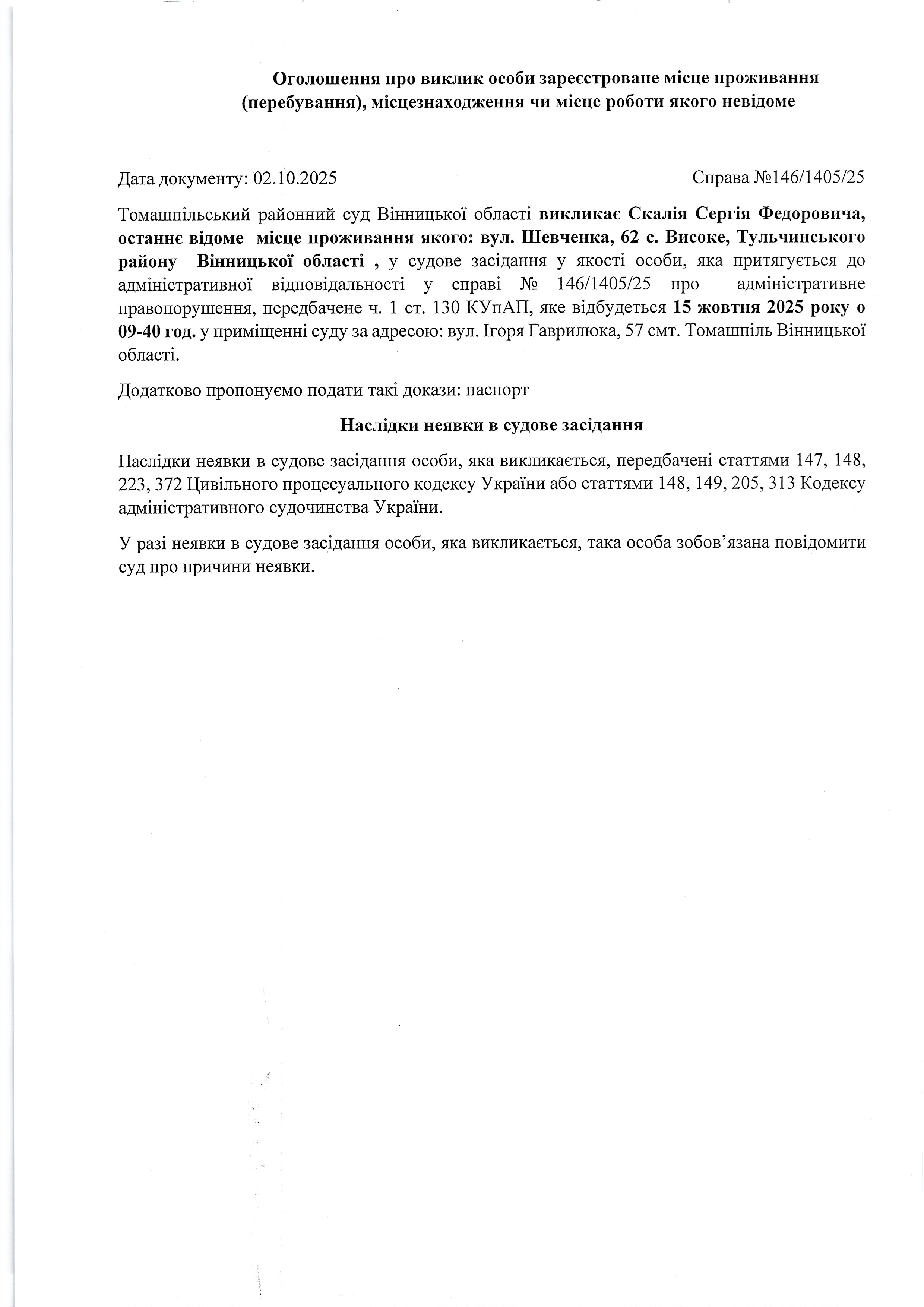 Оголошення про виклик до суду Скалія С.Ф. на 09:40 год. 15.10.2025