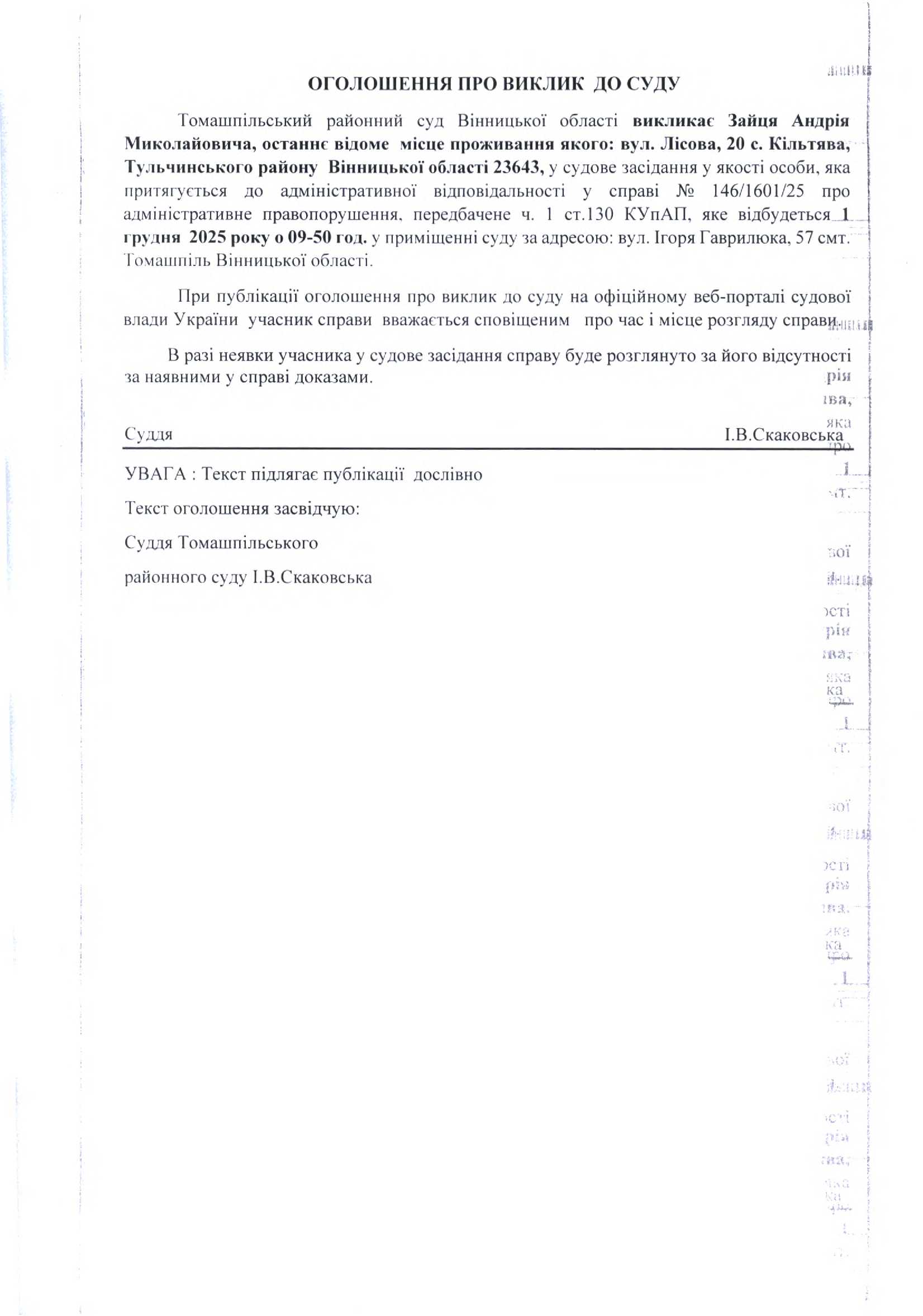 Оголошення про виклик до суду Зайця А.М. на 09:50 год. 01.12.2025