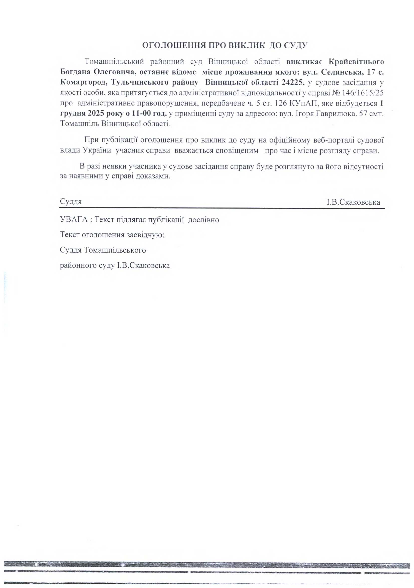 Оголошення про виклик до суду Крайсвітнього Б.О. на 11:00 год. 01.12.2025