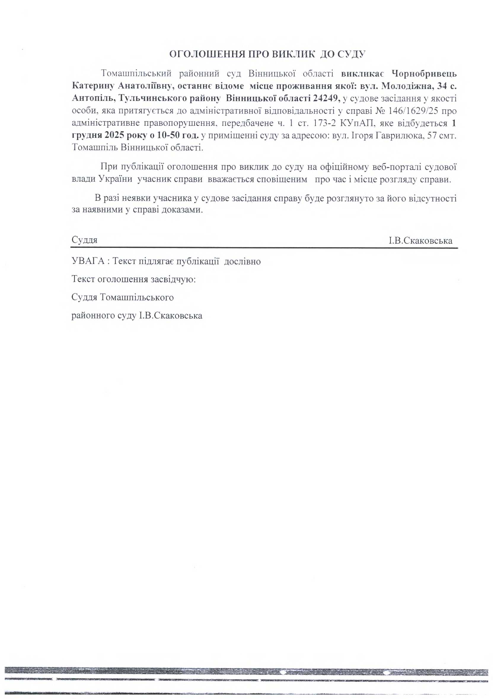 Оголошення про виклик до суду Чорнобривець К.А. на 10:50 год. 01.12.2025