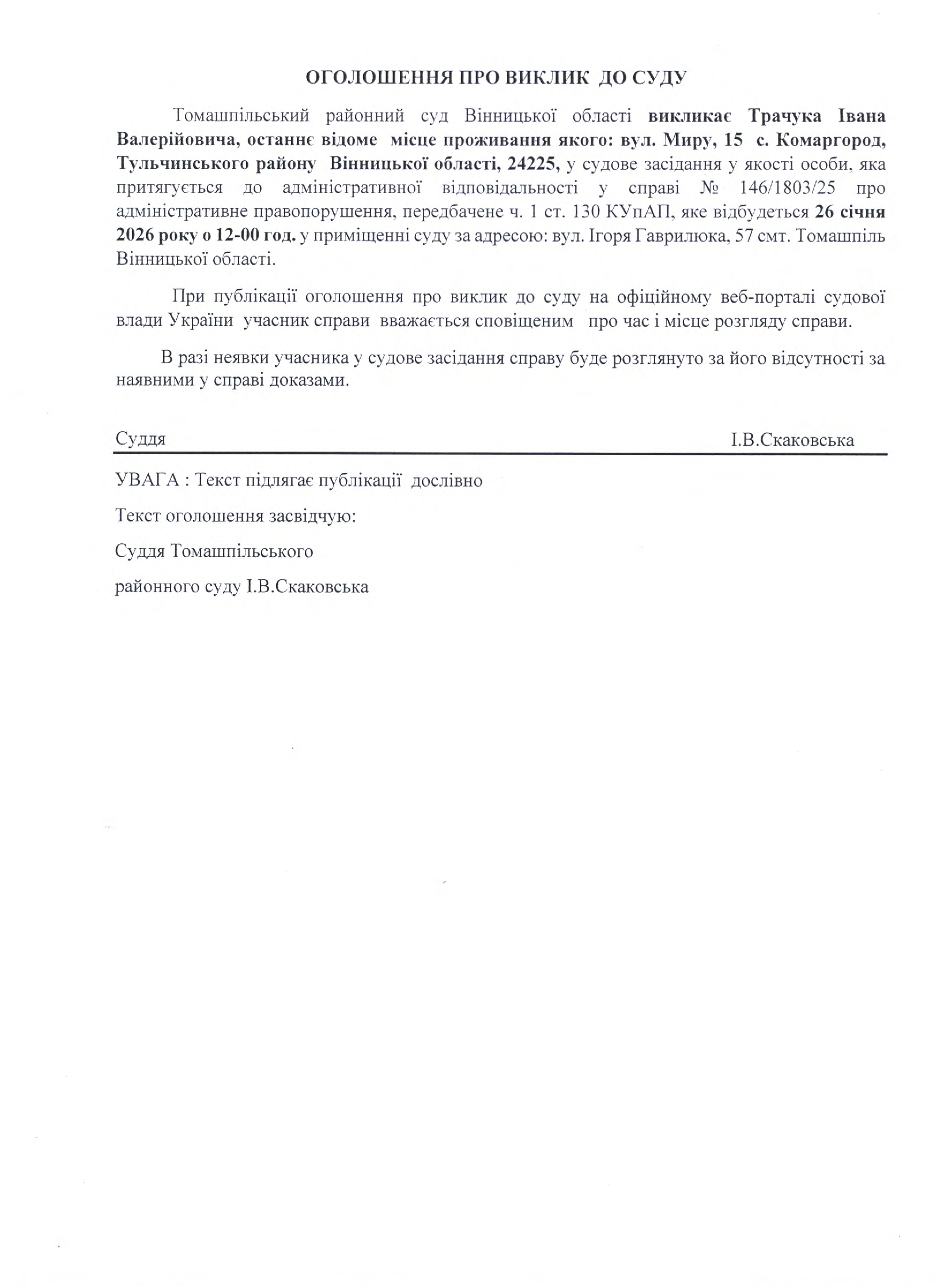 Оголошення про виклик до суду Трачука Івана Валерійовича.. на 12:00 год. 26.01.2026