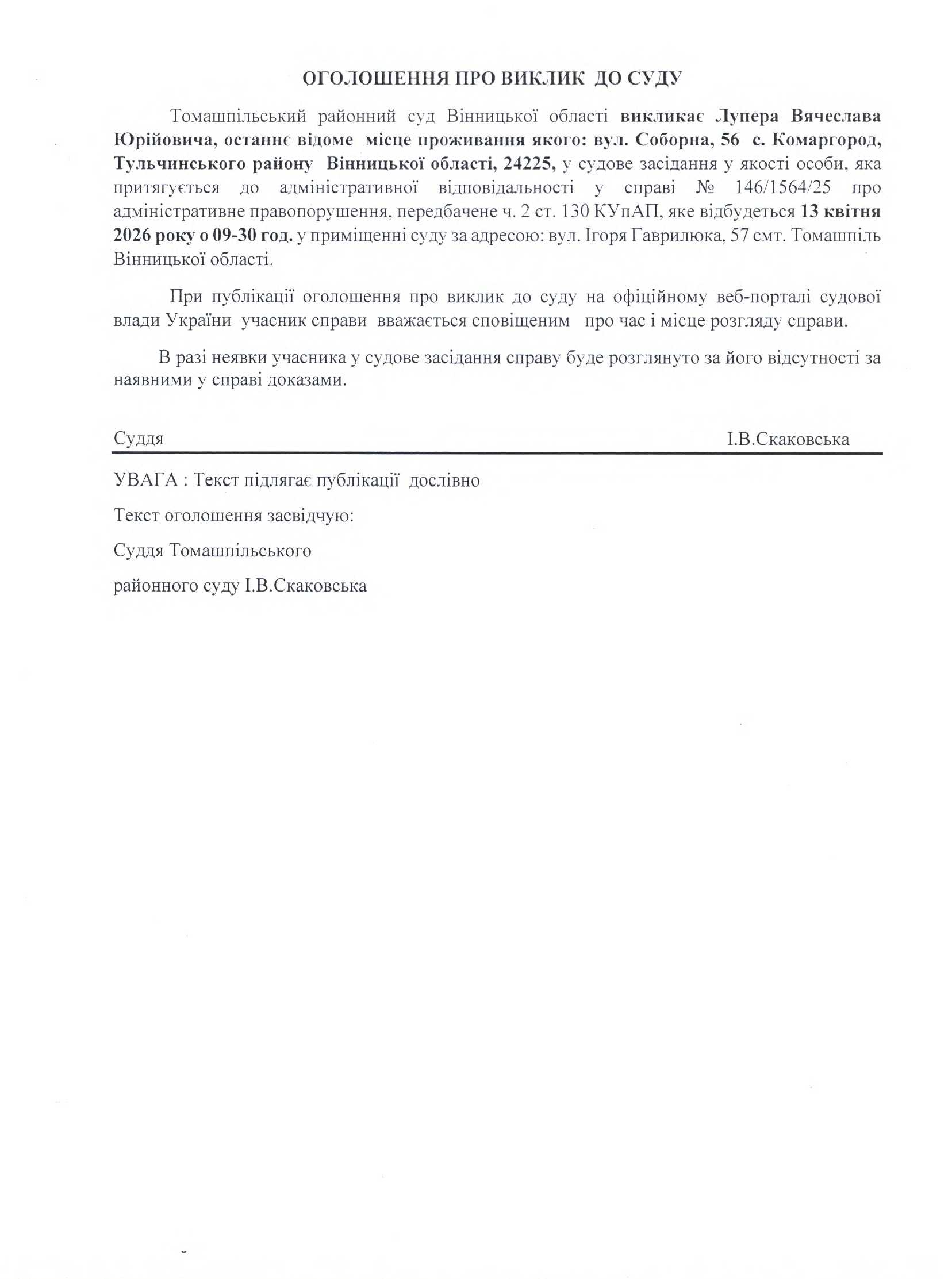 Оголошення про виклик до суду Лупера Вячеслава Юрійовича на 09:30 год. 13.04.2026